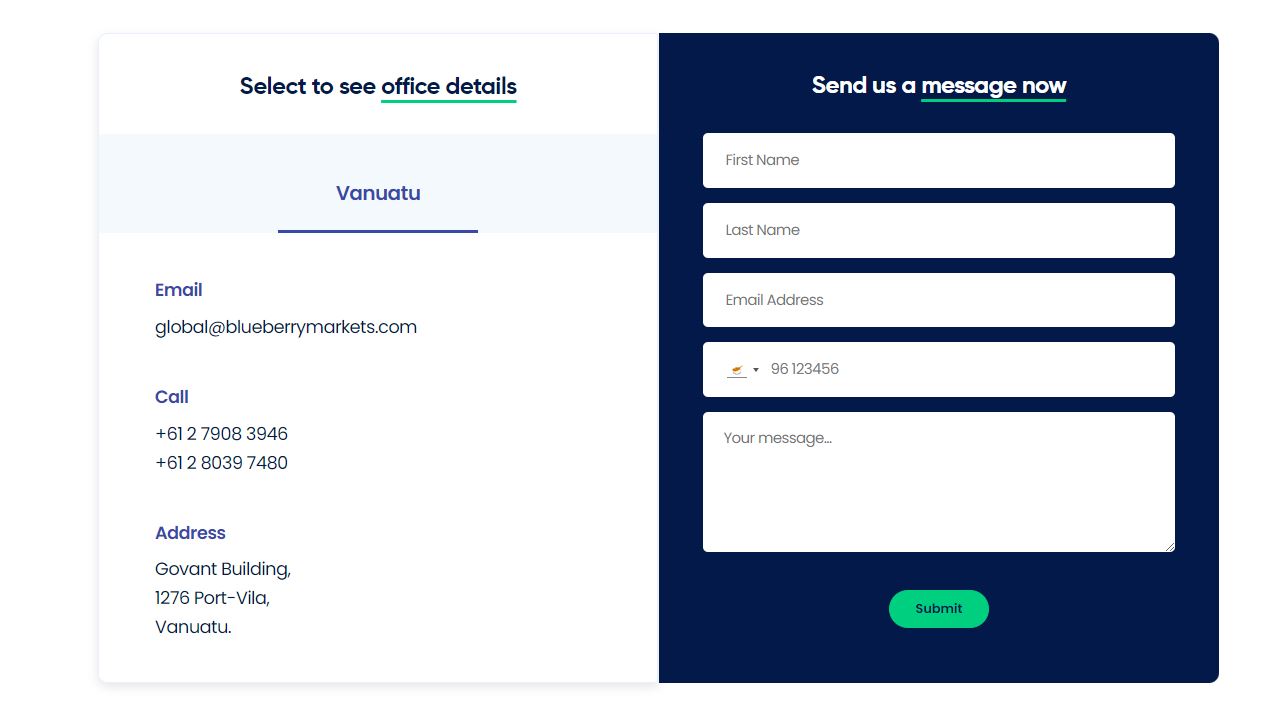 El equipo de soporte de Blueberry Markets se enorgullece de asegurar un servicio al cliente excepcional. El centro de soporte al cliente del bróker cuenta con un equipo de profesionales expertos dedicados a ayudar a los traders con cualquier pregunta o preocupación que puedan tener. Independientemente de la consulta, el equipo siempre está disponible y listo para asistir en cada paso del camino.