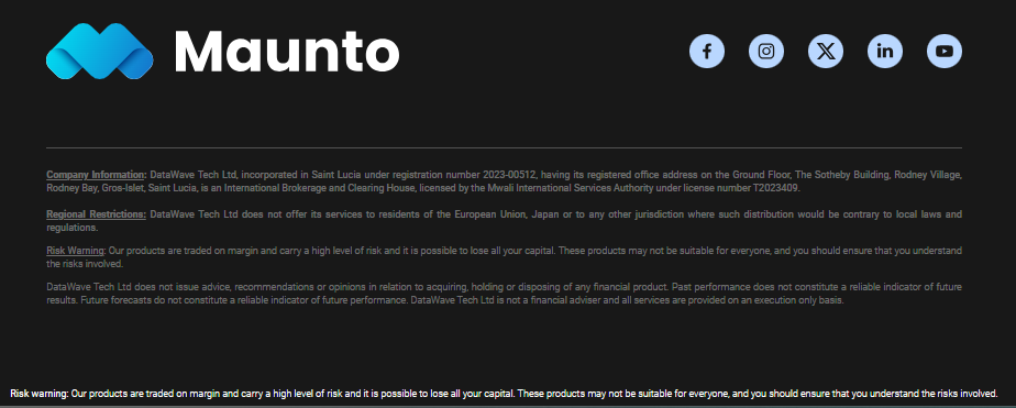 Maunto est opéré par DataWave Tech Ltd, une société enregistrée à Sainte-Lucie sous le numéro d’enregistrement 2023-00512. Il détient une licence de l’Autorité des Services Internationaux de Mwali sous le numéro de licence T2023409, garantissant la conformité avec les normes de l’industrie. Cette supervision réglementaire garantit que vos données et transactions sont protégées grâce à des processus stricts de Connaissance du Client et de Lutte contre le Blanchiment d’Argent, ainsi qu’à des fonds clients séparés.